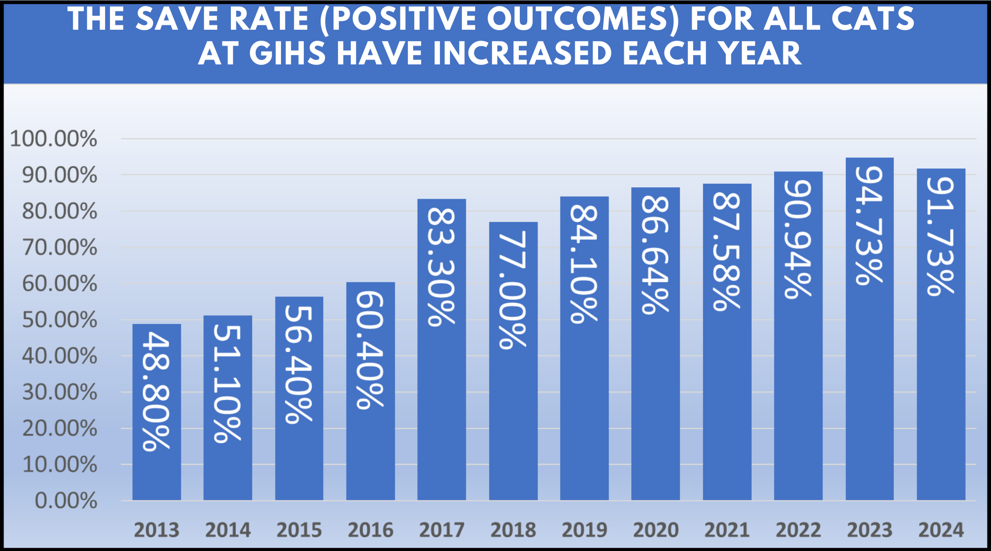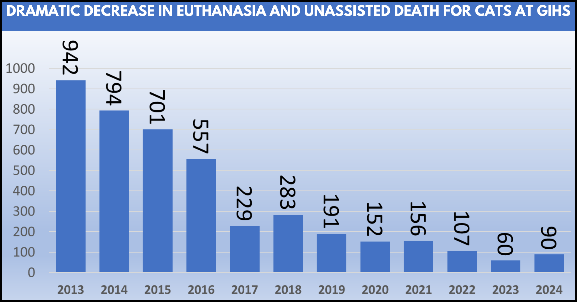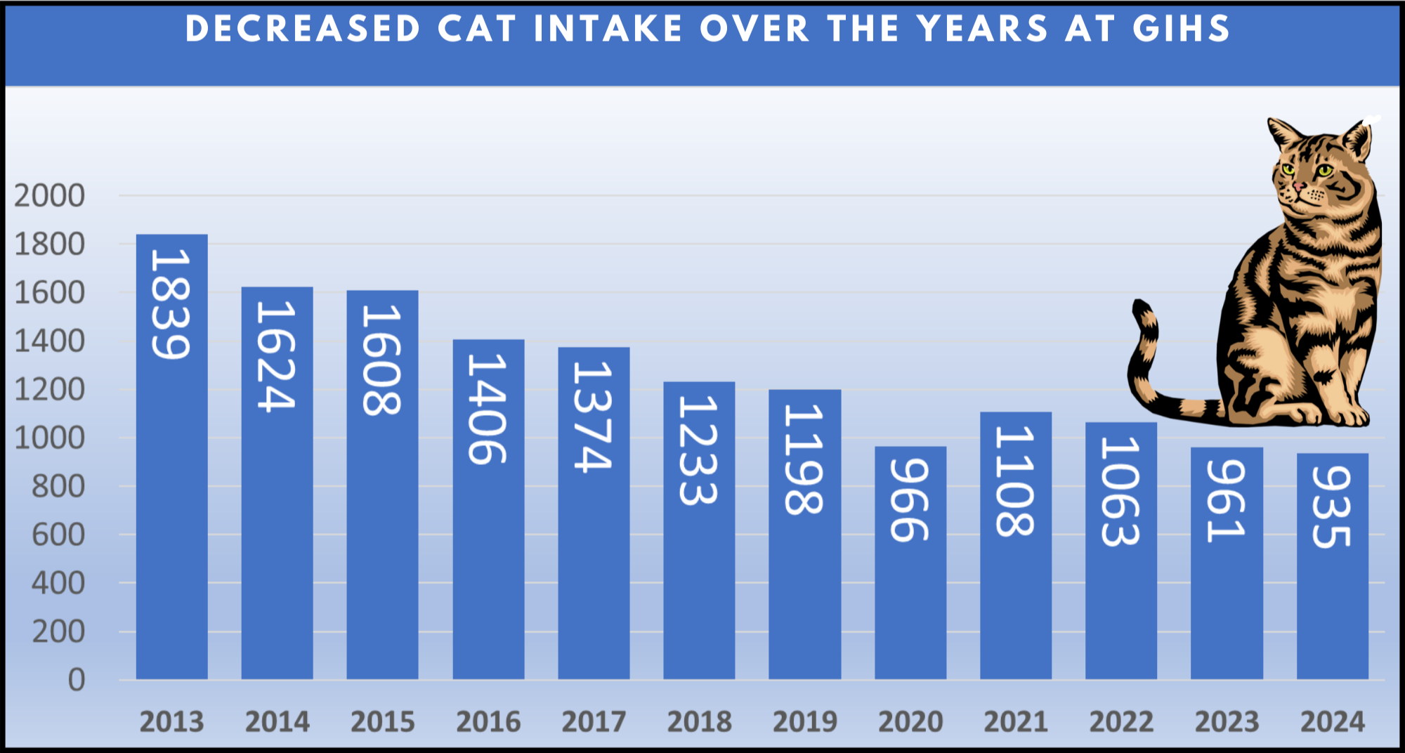 The main goal of the program is to reduce the annual intake of feral cats at GIHS as well as those running the streets. The live release rates at the GIHS have steadily increased over the years that this program has been in existence and our yearly intake has taken a nosedive, as shown by the following statistics: